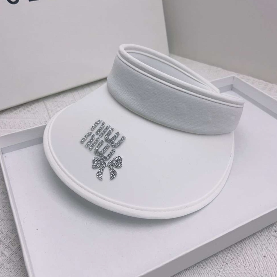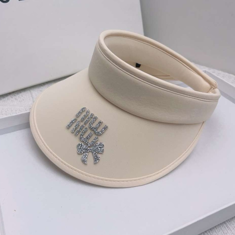 優雅なデザインのサンバイザー。額部分にはきらめくラインストーンで装飾されたリボンモチーフが施され、スポーティーながら上品な印象。